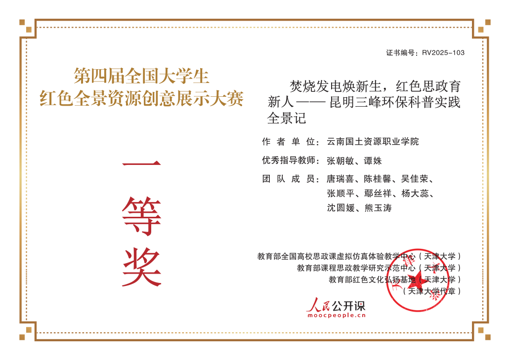 第四届全国大学生红色全景资源创意展示大赛结果于近日揭晓,云南国土资源职业学院学生作品《焚烧发电焕新生,红色思政育新人——昆明三峰环保科普实践全景记》荣获一等奖。本届大赛由教育部全国高校思政课虚拟仿真体验教学中心(天津大学)等多部门联合主办,吸引全国330余所高校提交1700余个作品,竞争异常激烈。 获奖作品由马克思主义学院教师张朝敏、谭姝指导,唐瑞喜等8位同学合作完成。团队坚持以调研为基础、以技术为支...