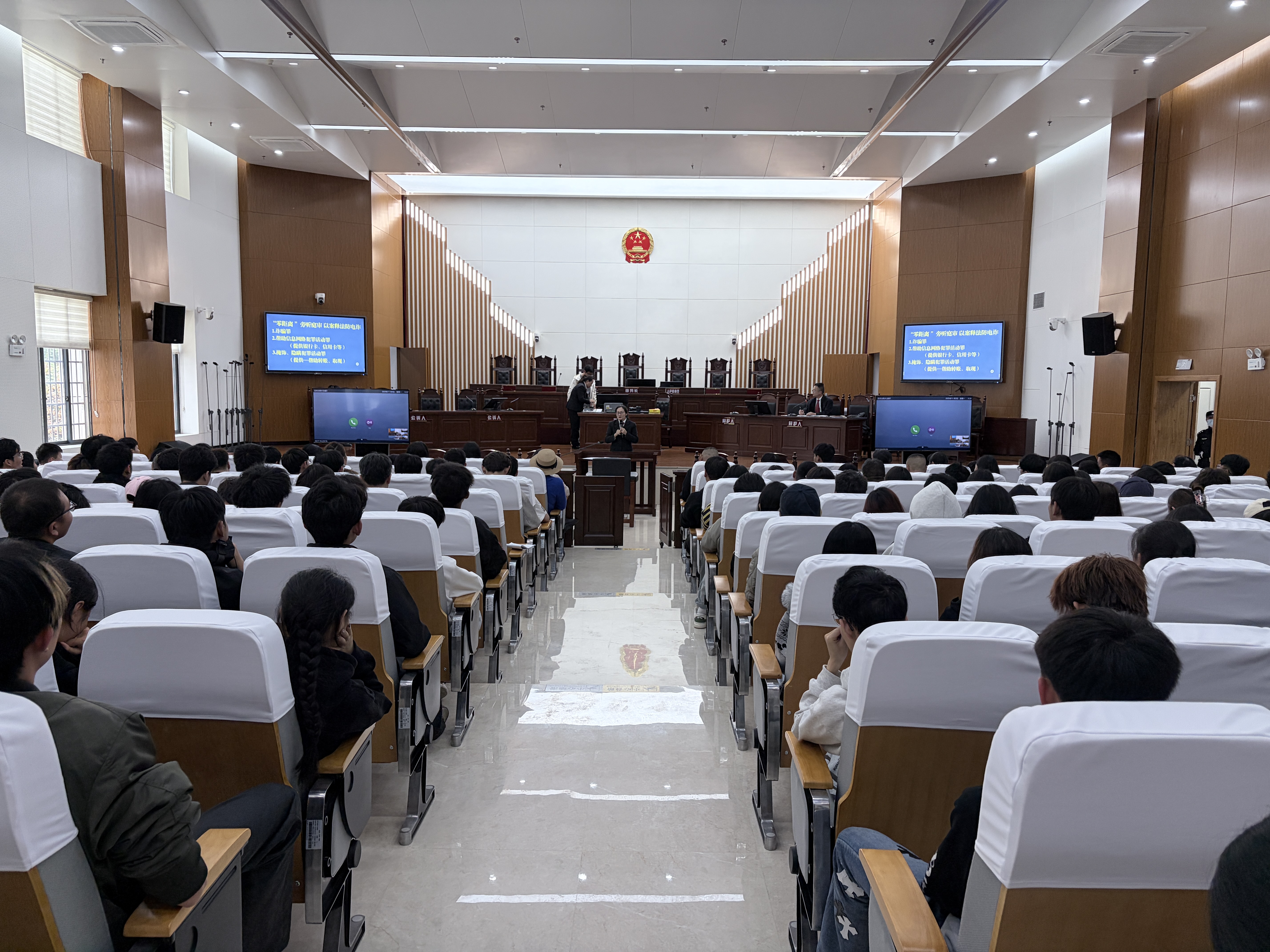 为深入贯彻实施《中华人民共和国法治宣传教育法》,扎实推进校园法治教育落地见效,11月6日下午,我校组织各二级学院150名学生代表赴宜良县人民法院旁听诈骗罪、帮助信息网络犯罪活动罪及掩饰、隐瞒犯罪活动罪公开庭审,以“沉浸式”普法开展一堂深刻的法治实践课。