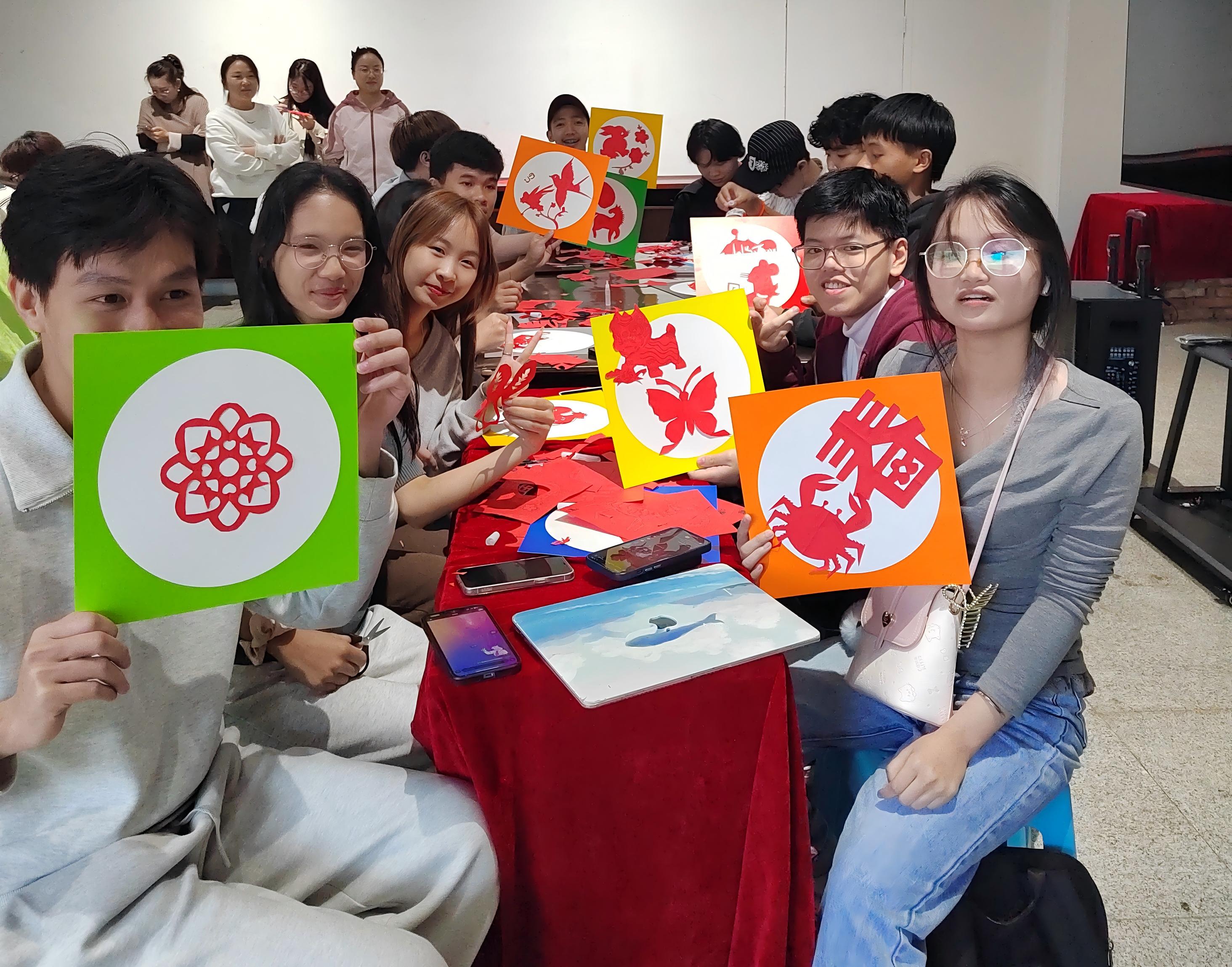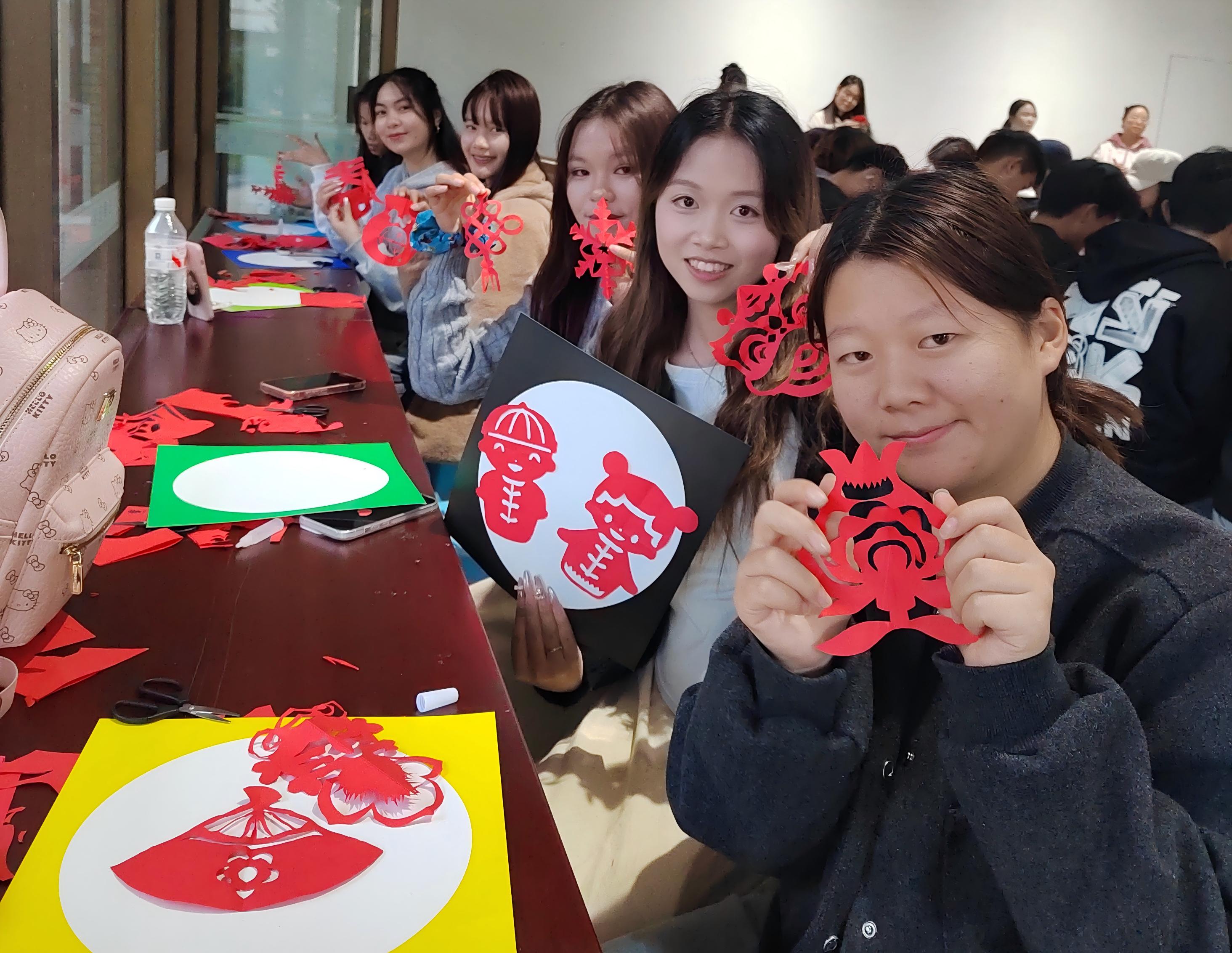 参观结束后,活动进入剪纸体验环节。在讲解员的细致指导下,中外学子纷纷动手,从折纸、勾勒到剪制,一步步完成属于自己的剪纸作品。现场气氛活跃,红纸翻飞间,中外学生相互交流创作心得,在协作中感受中国传统手工艺的独特魅力。