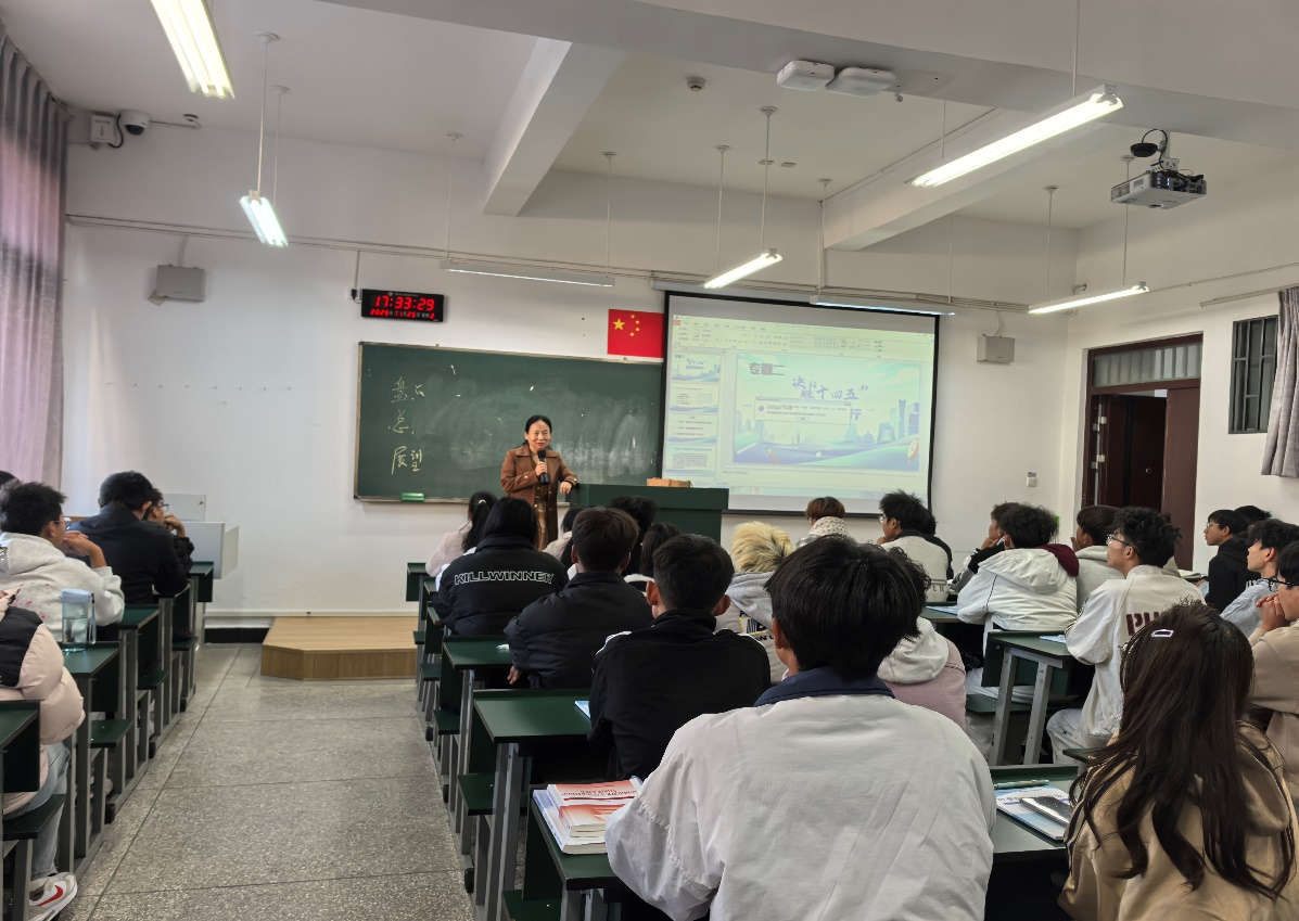 党委副书记、校长陈颖以“决胜十四五 奋发向前行”为题,紧扣职业教育“德技并修”的育人目标,依托学校数字化思政教学资源,将“十四五”期间智能制造、能源电力领域的发展成就与专业核心能力培养相结合。她以供配电技术升级、自动化生产线革新等行业突破为切入点,解读规划中“加快制造业转型升级”的战略意义,穿插云南能源公司、水利水电十四工程局等实训基地的技术应用案例,通过数字马院VR资源展示电气自动化技术在绿色能源建设中的实践成果,组织学生围绕“技能赋能高质量发展”展开研讨。既强化了学生对PLC应用技术、工业网络组态等专业知识的价值认同,又引导学生将个人职业发展融入“十四五”产业升级浪潮,激发了投身装备制造、能源建设领域的奋斗热情。