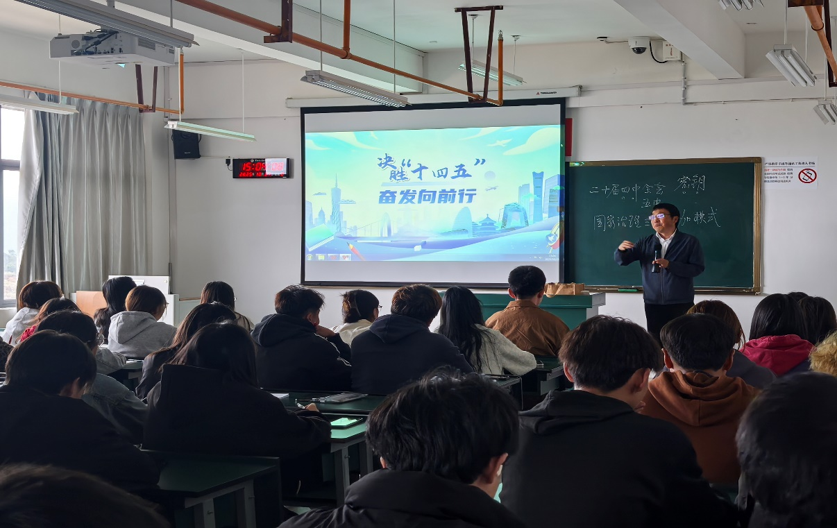 党委书记牛定柱以“决胜十四五 奋发向前行”为题,从国家、学校、个人三个维度系统解读了规划的重要意义,为学子指明了发展方向。他带着学生回顾国家“十四五”规划实施成效,并结合党的二十届四中全会精神,阐释了我国五年规划制度的历史传承与时代价值,并指出从“十四五”衔接2035年远景目标到2050年建成社会主义现代化强国的战略部署体现了国家治理的系统性与前瞻性,为青年成长提供了广阔舞台。他结合学校发展实际,总结了我校“十四五”期间在办学规模、专业建设、人才培养等方面的突破,并引导学生思考学校“十五五”发展规划落脚点,深刻理解学校“1958”工作格局。他寄语学生,要以国家和学校规划为指引,将个人理想融入时代洪流,在决胜“十四五”、奋进新征程中实现人生价值。