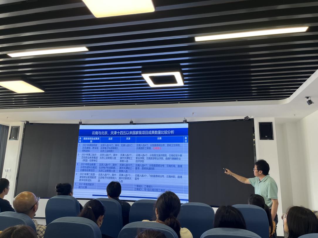 齐副校长结合到北京培训所感所悟,立足实际找差距。指出我们在政策学习、理念把握、整体谋划、带领团队、狠抓落实、工作状态六个方面的差距,如:理论学习不快、不深、不高、不宽;目标不明、思路不清、统筹不够;真带不够、真领不够、真做不够;别人比我们能干,还比我们勤奋;特别是云南与北京、天津“十四五”以来国家级成果差距明显。紧密结合学校“十四五”规划、提质培优行动计划、“双高”建设计划、党政工作要点等对资源环境学院的“双高”专业群建设——地质调查和矿产普查专业群建设进行了科学的分析和研究,查找学院发展实践过程中存在的难点、堵点、痛点、瘀点,为资环实践明确了任务、指明了方向。