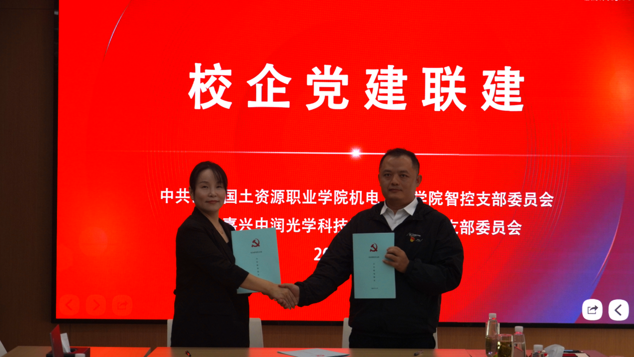 为深入贯彻落实新时代党的建设总要求,切实开展“党建带群建”工作,以党建引领产教深度融合,强化学院与学生实习企业的协同育人纽带,切实将党建优势转化为人才培养、产业服务的发展优势,10月22日,机电工程学院智控党支部与嘉兴中润光学科技股份有限公司党支部成功举办校企党建联建活动。