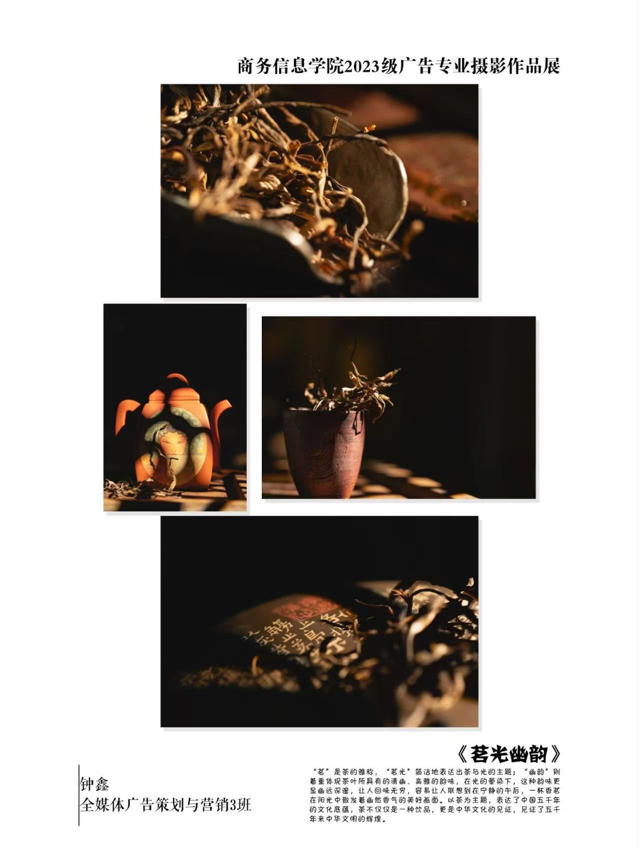 “理论与实践交融,镜头诠释创意灵魂”。作为全媒体广告策划与营销专业的核心课程,“广告摄影”注重将广告学理论与摄影实践深度融合。在课程中,学生通过市场调研、品牌定位、创意提案到拍摄执行的全流程训练,探索光影语言与品牌传播的关联性。展览现场,既有对传统商业摄影的精致呈现,如《茶韵东方——非遗茶品牌系列》通过光影质感传递文化底蕴;也有前沿技术的大胆尝试,如《创意广告》利系列作品用PS技术辅助生成与实景拍摄结合,构建视觉场景。