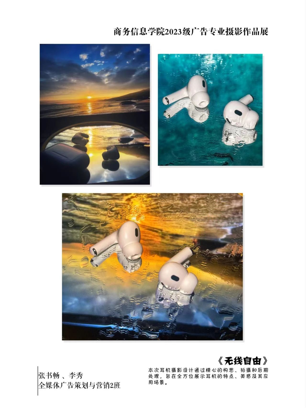 由商务信息学院主办的“视界·无界——2023级全媒体广告策划与营销专业“广告摄影”课程优秀作品展”在经开校区举办。本次展览以“广告摄影与光影叙事”为主题,集中展出了该专业学生创作的四十余组摄影作品,涵盖商业产品摄影、公益广告摄影、创意视觉实验等多个方向,展现了全媒体时代广告摄影的多元表达与创新活力。