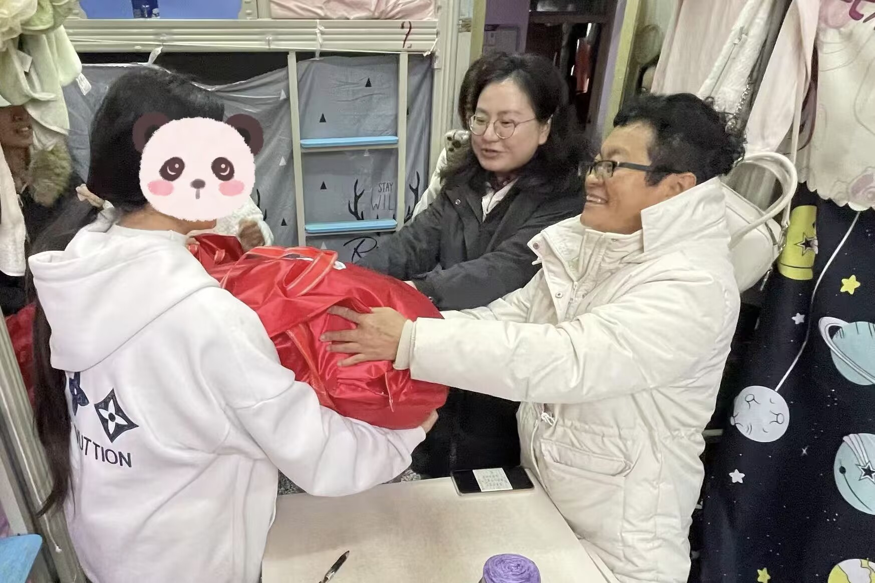 在绘臻苑三栋学生宿舍,寸建平亲自将厚实的毛毯递到受助学生手中,并关切地询问同学们的日常生活与学习状况。“天气虽冷,但学校永远是你们坚实的依靠,希望大家穿得暖、学得好,无畏寒冬。”校领导这温馨的叮嘱与关怀,如同一股暖流。