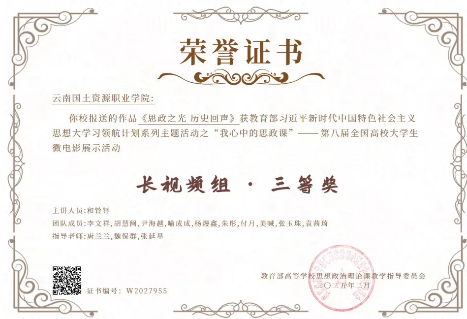 2025年,马院以数字马院建设为核心引擎,建成了集一基地、一平台、一中心、一资源库于一体的思政实践教育体系,其中的“VR+思政课虚拟仿真实践”教学平台,可将课程内容转化为可交互操作的虚拟情境,让学生在全感官刺激中深化理解,实现知、情、意、行的统一。制定了《云南国土资源职业学院数字马院建设规划》(2025年—2030年),完成“思想道德与法治”“毛泽东思想和中国特色社会主义理论体系概论”“习近平新时代中国特色社会主义思想概论”3个教研室思政课实践教学成果虚拟展厅的初步建设。