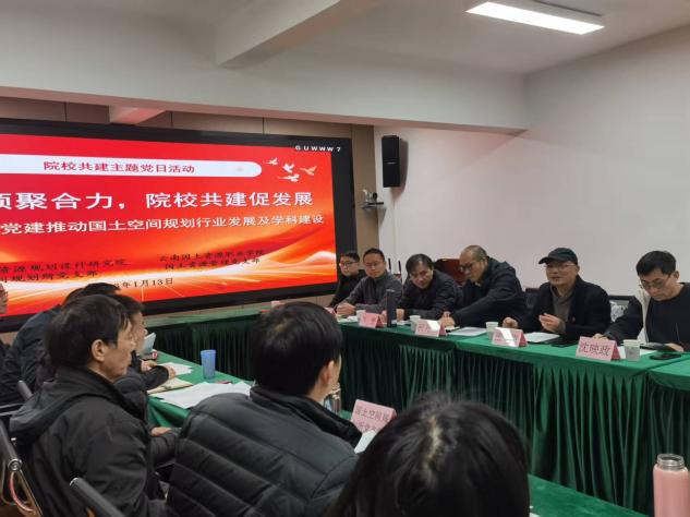 为深入贯彻落实新时代党的建设总要求,以高质量党建赋能国土空间规划与人才培养深度融合,1 月 13 日下午,国土空间信息学院国土管理党支部与云南省国土资源规划设计研究院国土空间规划所党支部,在云南省国土资源规划设计研究院二楼会议室联合开展支部共建活动。学院院长张洪、副院长沈映政、党委副书记和万荣,国土管理党支部书记张宏品及支部党员教师代表共同参与此次活动。