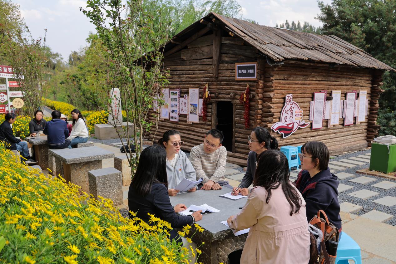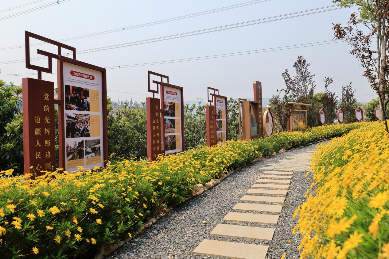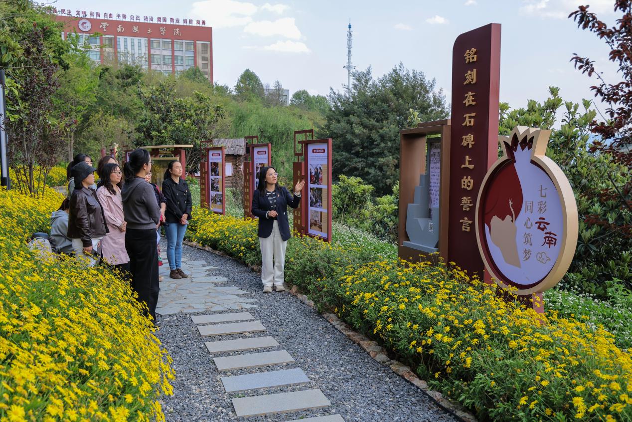 基地建设负责人、马克思主义学院党总支书记乔文红介绍,基地紧扣国家及云南省相关部署,深入贯彻习近平总书记关于加强和改进民族工作的重要思想,立足云南民族地区实际及办学特色,打造国家篇—云南篇—学校篇三维文化长廊。国家篇呈现的主要是习近平总书记关于民族工作的重要论述、党中央关于民族团结的政策要求。云南篇主要回顾习近平总书记考察云南重要讲话精神以及回信贺信精神,深情回顾习近平总书记对云南各族人民的重要嘱托和殷殷关怀;同时挖掘选取与学校专业相关的云南民族团结故事和人物,以展现地质、国土等行业为民族团结贡献力量的故事。学校篇聚焦脱贫攻坚、乡村振兴和学生实践三大块,原样拆装兰坪木楞房、实景复刻绿春蘑菇房,生动讲述在脱贫攻坚和乡村振兴工作中的国土实践,通过“国土榜样”展示学校育人成效,构建沉浸式、实景化思政育人新阵地。