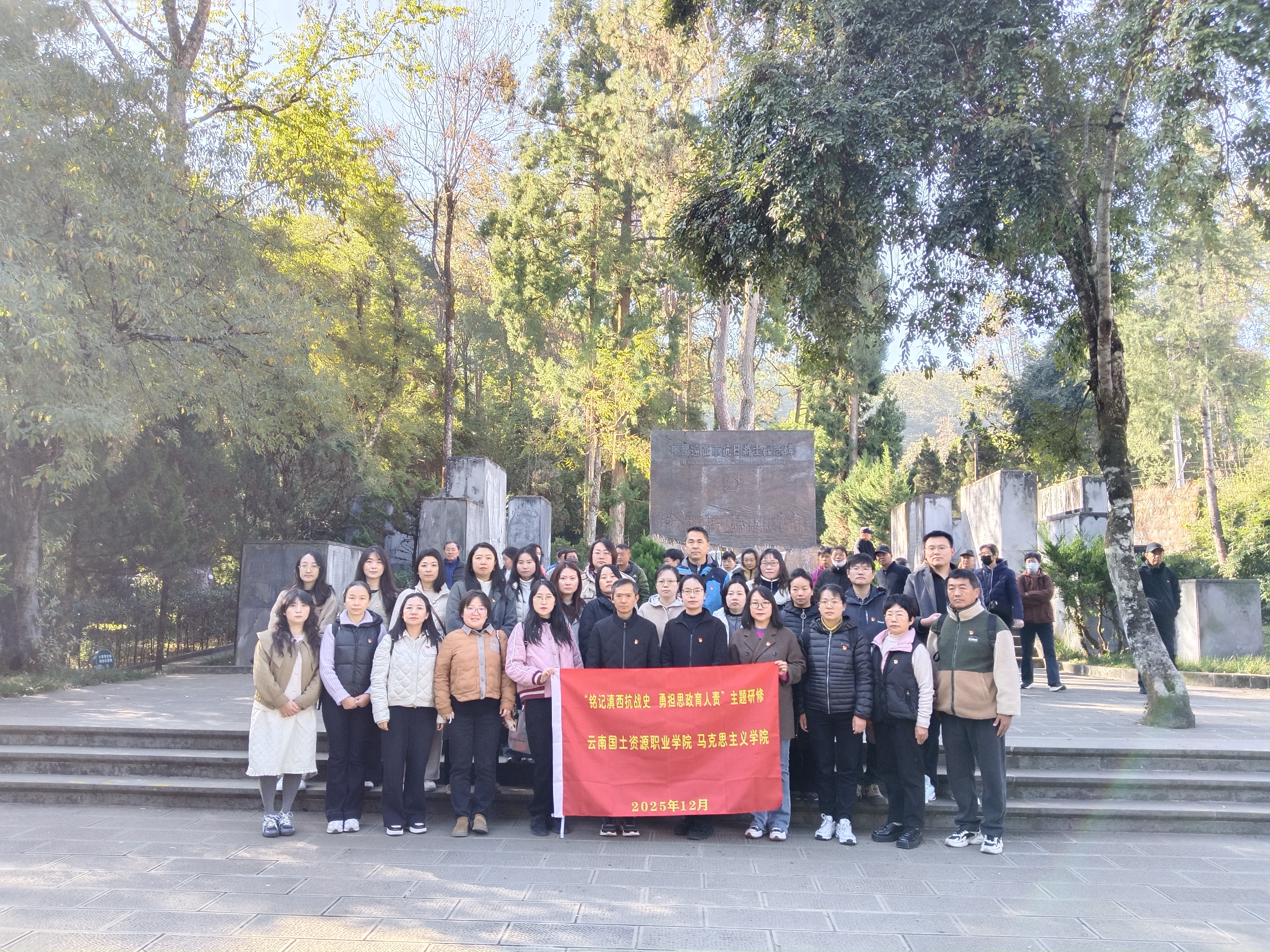 今年正值纪念中国人民抗日战争暨世界反法西斯战争胜利80周年之际,为传承和弘扬伟大抗战精神,12月20日至22日,马克思主义学院组织全体思政课教师赴腾冲开展“铭记滇西抗战史 勇担思政育人责”主题研修。 20日下午,研修班在腾冲市市委党校正式开班,马克思主义学院党总支书记乔文红同志做开班动员并授旗。腾冲市市委党校黄彪教授做“不灭的记忆——滇西抗战”主题讲座,通过滇缅公路、中国远征军、滇西战役、永不忘记四个篇...