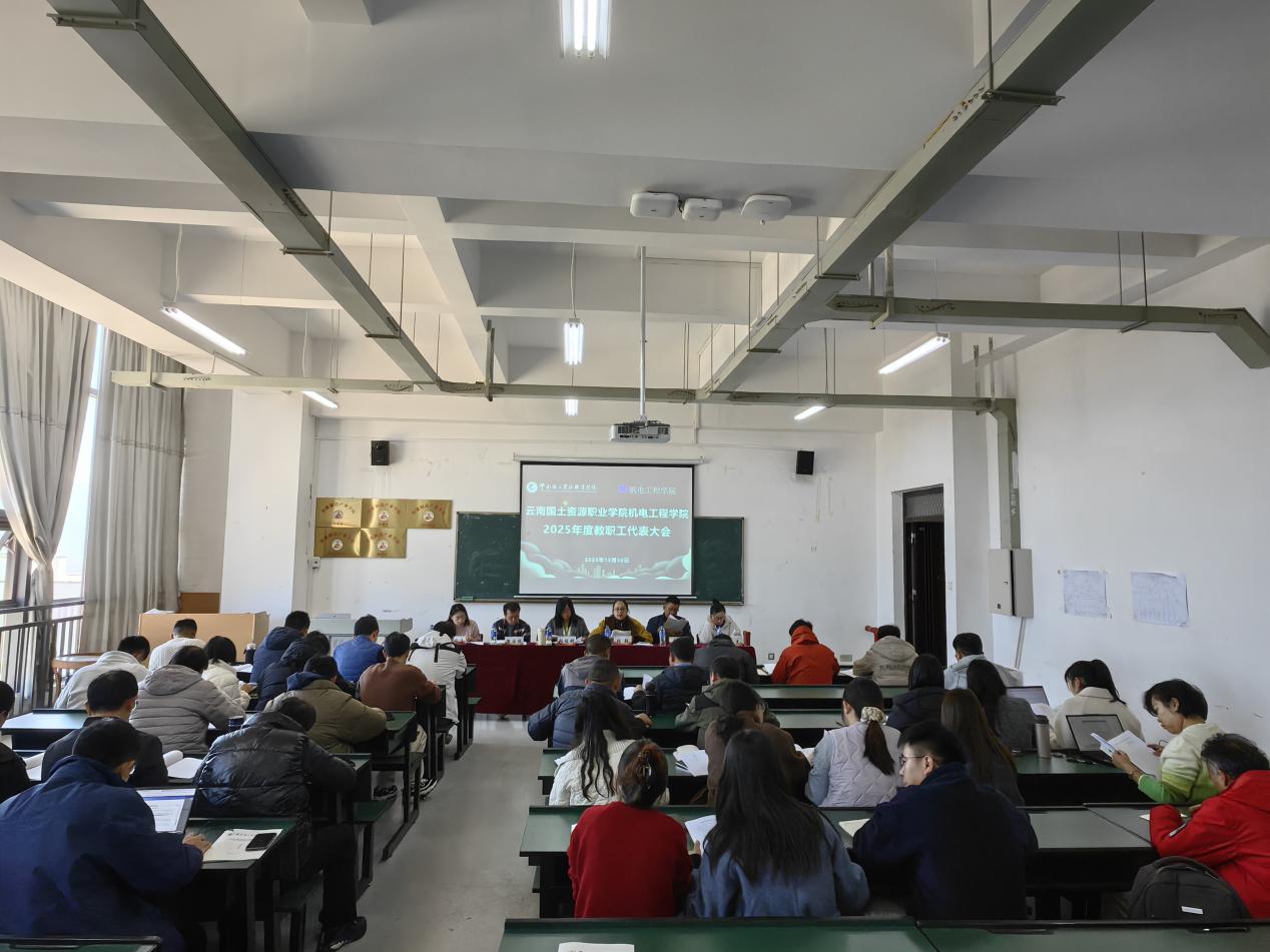 12月30日,云南国土资源职业学院机电工程学院2025年度教职工代表大会在明尚楼A216召开。本次大会由机电工程学院党委书记张颖主持,学院全体教职工参加。预备会上,全体教职工审议通过大会议程、大会表决办法(草案)以及大会主席团、秘书长建议名单。会上,学院院长张俊妍作学院2025年度工作报告。经过分组讨论和主席团会议,大会表决通过了《机电工程学院2025年度工作报告》《机电工程学院2025财务报告》《机电工程学院绩效工...