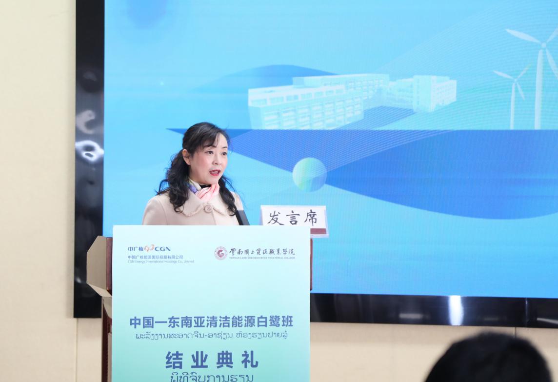 陈颖在致辞中代表学校对本次培训班的顺利完成表示祝贺,祝贺所有培训学员经过这段时间的努力,顺利完成了培训课程和通过考核,按期结业。她表示,此次与中国广核能源国际控股有限公司合作共同承办的中国——东南亚清洁能源白鹭班,是推进“教随产出、产教同行”的具体实践。下一步,我校有信心与中国广核能源国际控股有限公司紧密围绕新能源领域开展更加深度和广泛的校企合作,培养中资企业亟需的国际化技能人才,为“留学中国•学在云南”贡献国土力量。
