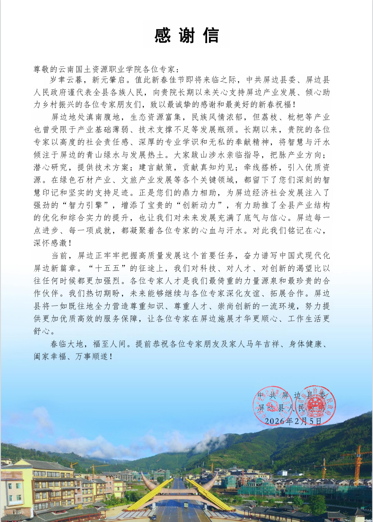 值此新春佳节即将来临之际,中共屏边县委、屏边县人民政府向我校发来感谢信,对学校专家团队长期以来助力屏边产业发展、服务乡村振兴表示衷心感谢,并送上新春美好祝愿。