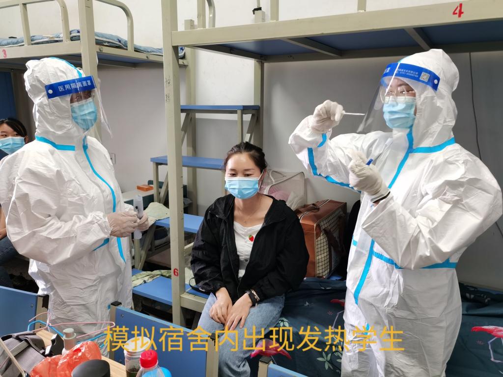 本次防疫实操演练分别模拟了师生有序入校的各种情形。从体温检测、出示健康码及行程码到模拟校门口发现发热学生情况处置以及学生进校后,宿舍发现发热突发情况处置、预检分诊点发现发热患者处置、临时隔离观察室处理疑似病例等场景。所有参与人员事先做好防护措施,在学生不返校的情况下,模拟人物角色,积极配合开展返校各类场景演练,所有成员严格按照方案操作流程分工协作,密切合作,整场演练紧张有序,环环相扣。