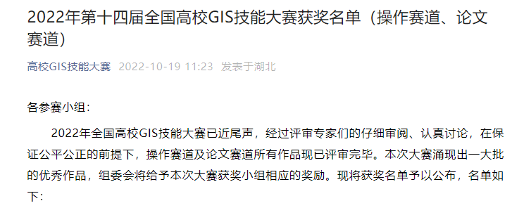 近日,由中国测绘学会、中国地理信息产业协会、国家地理信息系统工程技术研究中心、地理信息系统产业技术创新战略联盟主办的2022年第十四届全国大学生GIS技能大赛圆满落幕,我校国土空间信息学院2020级学生杨红、赵勇峻、杨金萍组成的代表队在此次大赛操作赛道三维建模方向荣获二等奖。